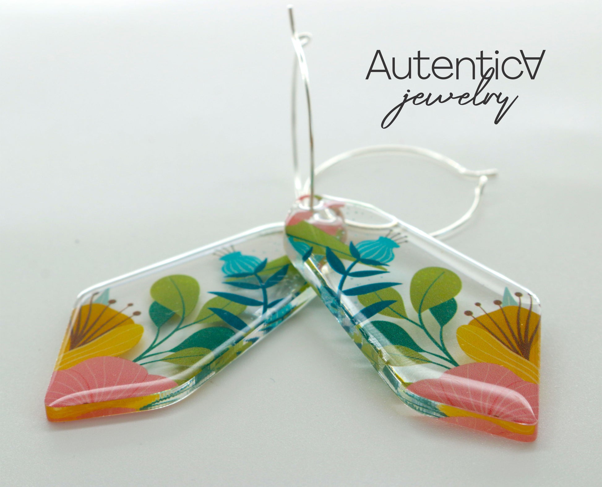 Acrylic Glass Earrings / Floral Print Style Earrings / Colorful Earrings